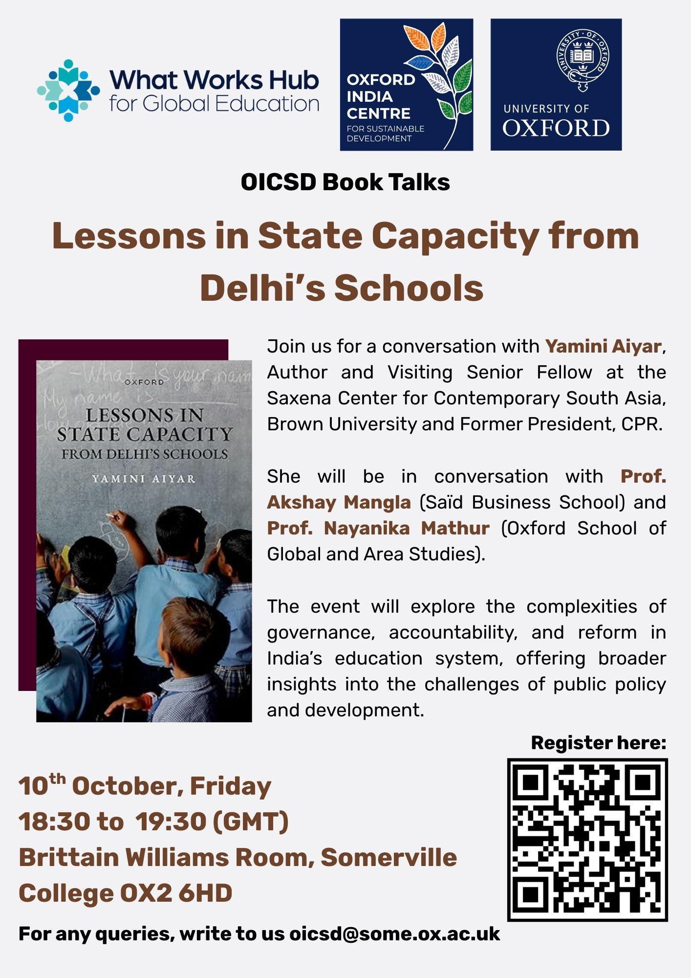 Join us for a conversation with Yamini Aiyar, author of Lessons in State Capacity from Delhi’s Schools and former President & CEO of the Centre for Policy Research, New Delhi. She will be in discussion with Prof. Akshay Mangla (Saïd Business School) and Prof. Nayanika Mathur (School of Anthropology & Museum Ethnography). The event will explore the complexities of governance, accountability, and reform in India’s education system, offering broader insights into the challenges of public policy and development.